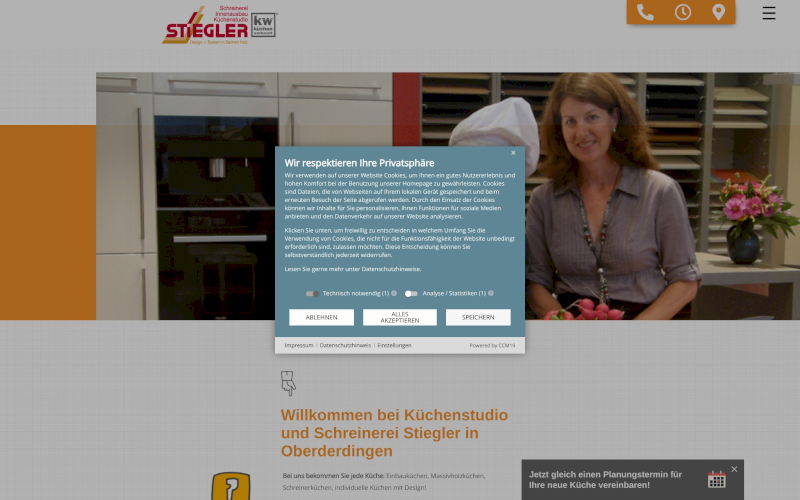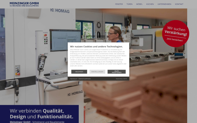 Das Herzstück von CCM19 für Ihre Schreinereien Webseite, Onlineshop oder sonstige Applikation - der Cookie Banner für Schreinereien. Mit diesem Banner realisieren Sie auf Ihrer Webseite die notwendige Zustimmung zum Setzen von diversen Cookies und zum ausführen von (Tracking)Skripten.