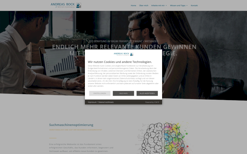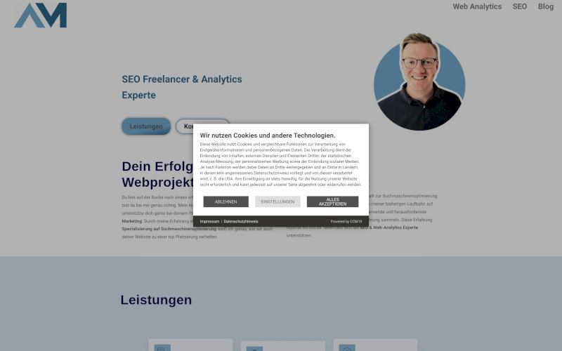 Das Herzstück von CCM19 für Ihre SEO-Agenturen Webseite, Onlineshop oder sonstige Applikation - der Cookie Banner für SEO-Agenturen. Mit diesem Banner realisieren Sie auf Ihrer Webseite die notwendige Zustimmung zum Setzen von diversen Cookies und zum ausführen von (Tracking)Skripten.