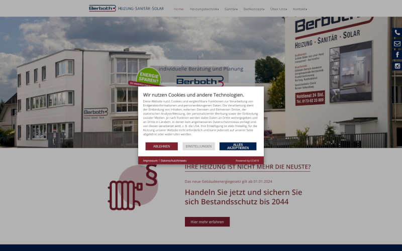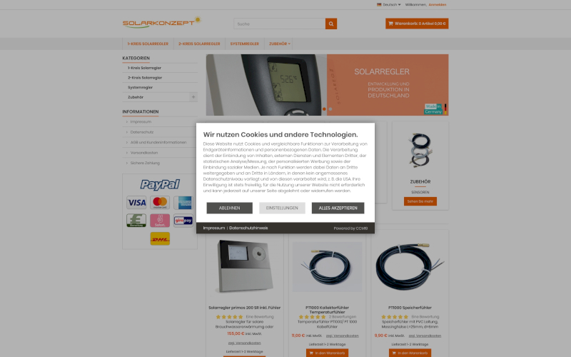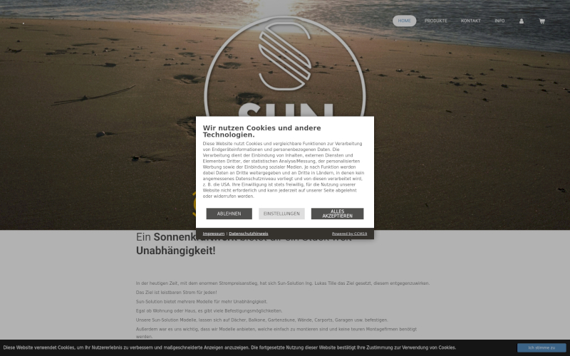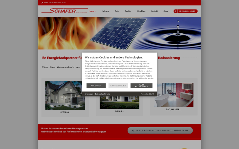 Das Herzstück von CCM19 für Ihre Solartechnik Webseite, Onlineshop oder sonstige Applikation - der Cookie Banner für Solartechnik. Mit diesem Banner realisieren Sie auf Ihrer Webseite die notwendige Zustimmung zum Setzen von diversen Cookies und zum ausführen von (Tracking)Skripten.