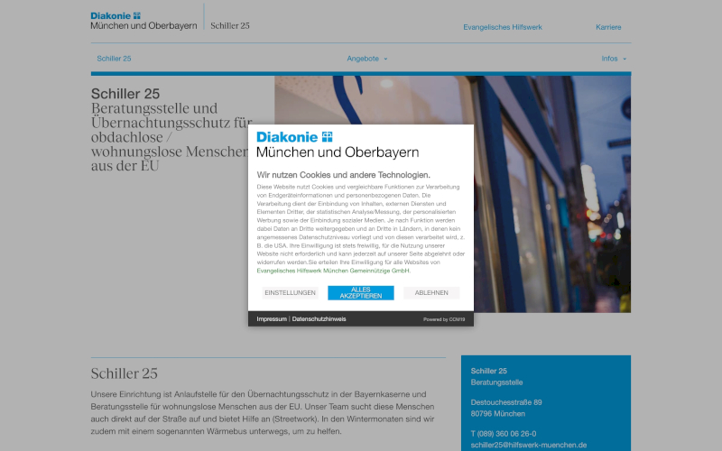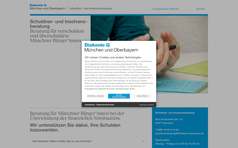 Das Herzstück von CCM19 für Ihre Sozialberatungsstellen Webseite, Onlineshop oder sonstige Applikation - der Cookie Banner für Sozialberatungsstellen. Mit diesem Banner realisieren Sie auf Ihrer Webseite die notwendige Zustimmung zum Setzen von diversen Cookies und zum ausführen von (Tracking)Skripten.