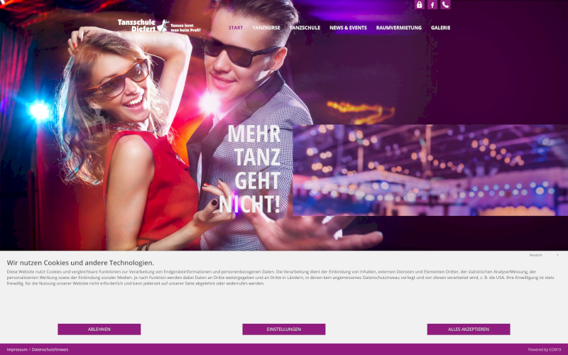 Das Herzstück von CCM19 für Ihre Tanzschulen Webseite, Onlineshop oder sonstige Applikation - der Cookie Banner für Tanzschulen. Mit diesem Banner realisieren Sie auf Ihrer Webseite die notwendige Zustimmung zum Setzen von diversen Cookies und zum ausführen von (Tracking)Skripten.