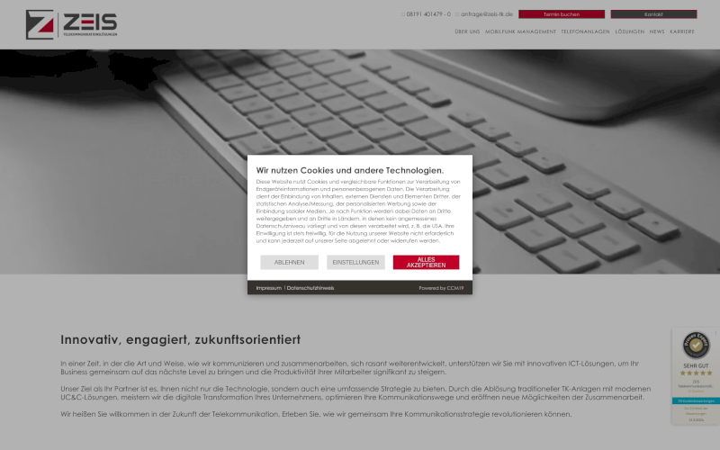 Finden Sie den optimalen Cookie Consent Manager für Telekommunikationsunternehmen: Entdecken Sie CCM19 - maßgeschneidert für Ihre Branche! Maximieren Sie die Zustimmung mit CCM19: 100% datenschutzkonform, keine Datenübertragung ins Ausland, plus flexibler OnPremise oder Cloud-Service.