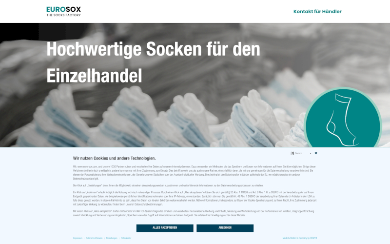 Das Herzstück von CCM19 für Ihre Textilunternehmen Webseite, Onlineshop oder sonstige Applikation - der Cookie Banner für Textilunternehmen. Mit diesem Banner realisieren Sie auf Ihrer Webseite die notwendige Zustimmung zum Setzen von diversen Cookies und zum ausführen von (Tracking)Skripten.