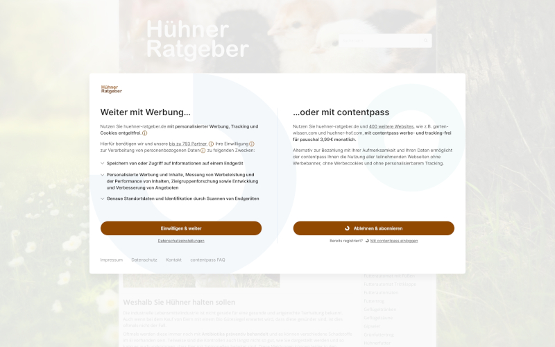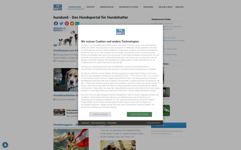 Das Herzstück von CCM19 für Ihre Tierbedarf-Großhändler Webseite, Onlineshop oder sonstige Applikation - der Cookie Banner für Tierbedarf-Großhändler. Mit diesem Banner realisieren Sie auf Ihrer Webseite die notwendige Zustimmung zum Setzen von diversen Cookies und zum ausführen von (Tracking)Skripten.
