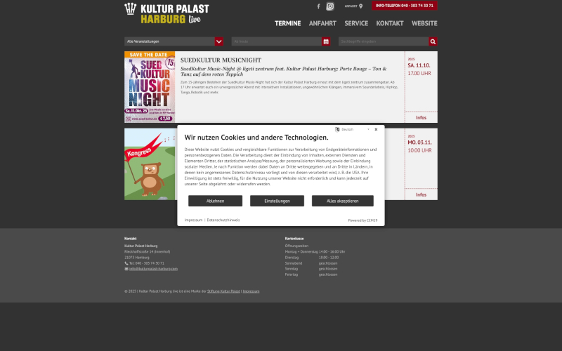 CCM19 bietet Veranstaltungsorten eine datenschutzkonforme, flexible und benutzerfreundliche Lösung, um die Einwilligung ihrer Website-Besucher zu verwalten. Mit Servern in Deutschland, die eine hohe Datensicherheit garantieren und unabhängig von US-Anbietern wie AWS oder Google Cloud sind, stellt CCM19 sicher, dass Ihre Daten unter strengsten Datenschutzbedingungen gespeichert werden.