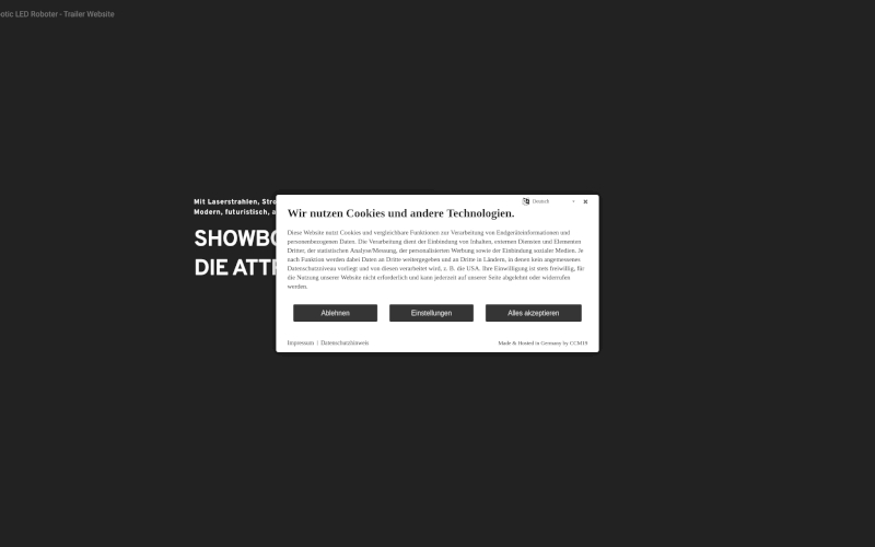 Das Herzstück von CCM19 für Ihre Veranstaltungstechnik-Firmen Webseite, Onlineshop oder sonstige Applikation - der Cookie Banner für Veranstaltungstechnik-Firmen. Mit diesem Banner realisieren Sie auf Ihrer Webseite die notwendige Zustimmung zum Setzen von diversen Cookies und zum ausführen von (Tracking)Skripten.