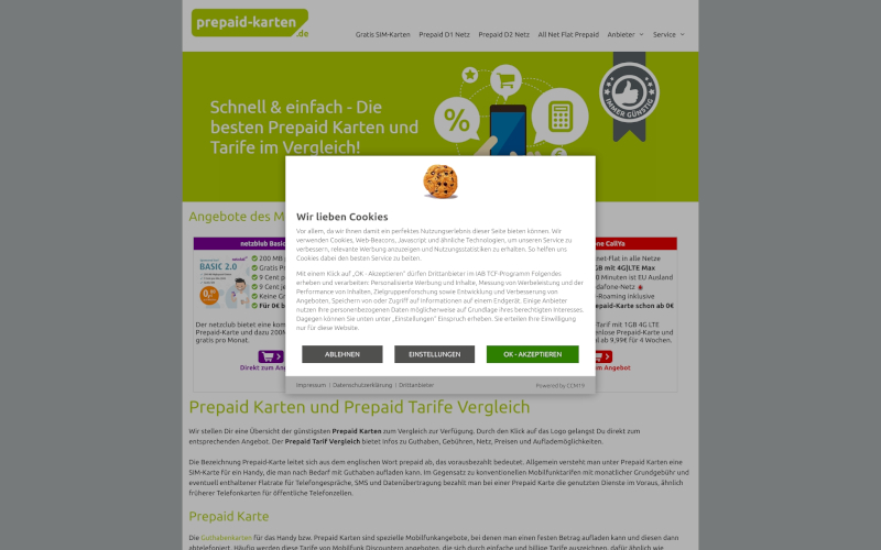 Das Herzstück von CCM19 für Ihre Vergleichsportale Webseite, Onlineshop oder sonstige Applikation - der Cookie Banner für Vergleichsportale. Mit diesem Banner realisieren Sie auf Ihrer Webseite die notwendige Zustimmung zum Setzen von diversen Cookies und zum ausführen von (Tracking)Skripten.