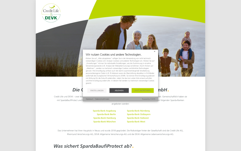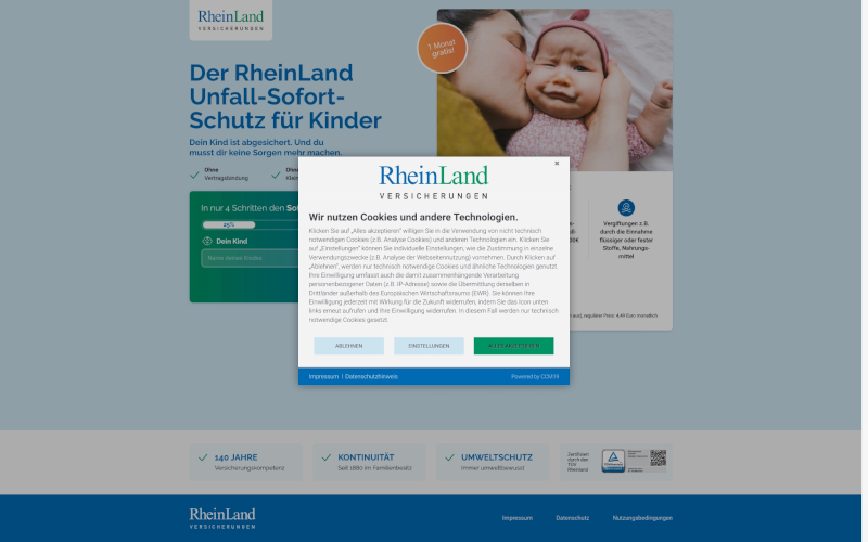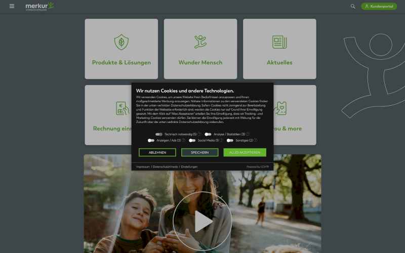 Das Herzstück von CCM19 für Ihre Versicherer Webseite, Onlineshop oder sonstige Applikation - der Cookie Banner für Versicherer. Mit diesem Banner realisieren Sie auf Ihrer Webseite die notwendige Zustimmung zum Setzen von diversen Cookies und zum ausführen von (Tracking)Skripten.