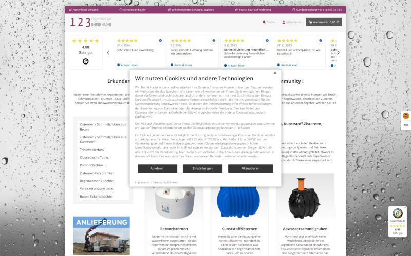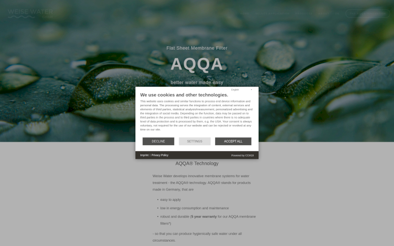 Das Herzstück von CCM19 für Ihre Wasserwirtschaft Webseite, Onlineshop oder sonstige Applikation - der Cookie Banner für Wasserwirtschaft. Mit diesem Banner realisieren Sie auf Ihrer Webseite die notwendige Zustimmung zum Setzen von diversen Cookies und zum ausführen von (Tracking)Skripten.