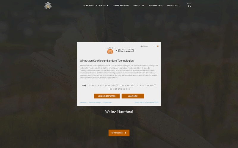 Das Herzstück von CCM19 für Ihre Weinbauer Webseite, Onlineshop oder sonstige Applikation - der Cookie Banner für Weinbauer. Mit diesem Banner realisieren Sie auf Ihrer Webseite die notwendige Zustimmung zum Setzen von diversen Cookies und zum ausführen von (Tracking)Skripten.