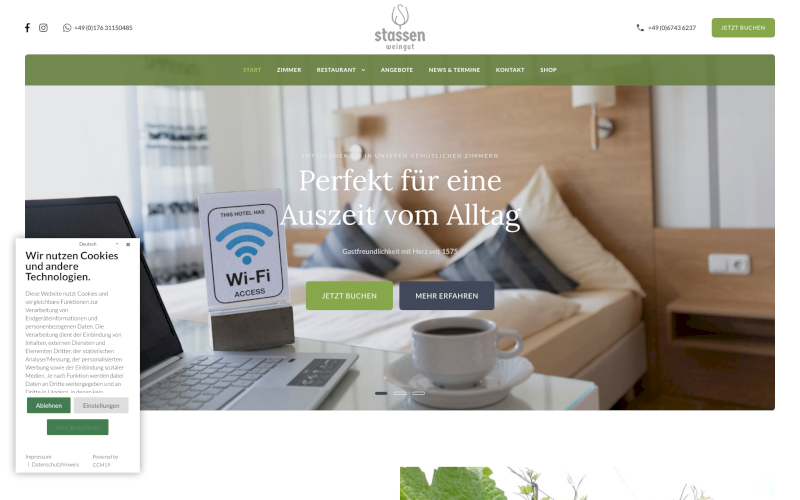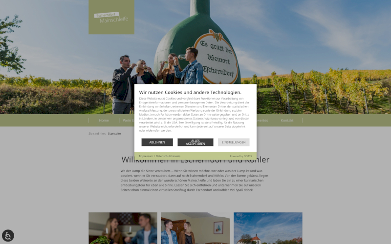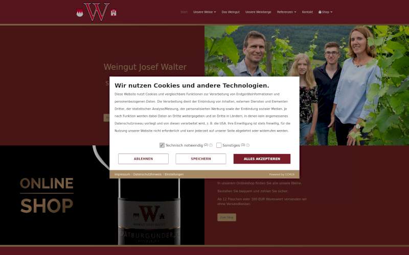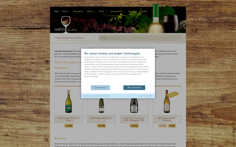 Das Herzstück von CCM19 für Ihre Weinhandel Webseite, Onlineshop oder sonstige Applikation - der Cookie Banner für Weinhandel. Mit diesem Banner realisieren Sie auf Ihrer Webseite die notwendige Zustimmung zum Setzen von diversen Cookies und zum ausführen von (Tracking)Skripten.