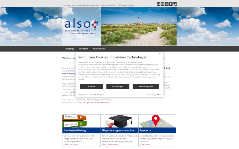 Die Anforderungen an Weiterbildungsinstitute in Bezug auf Datenschutz und Nutzertransparenz waren noch nie so hoch wie heute. Mit CCM19 erhalten Sie einen Cookie Consent Manager, der nicht nur eine umfassende Rechtskonformität gewährleistet, sondern auch das Potenzial hat, das Nutzervertrauen zu stärken und Ihre Marke positiv zu prägen. Machen Sie Ihre Webseite mit CCM19 zum Vorreiter im Datenschutz unter den Weiterbildungsinstituten.