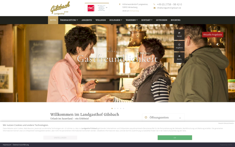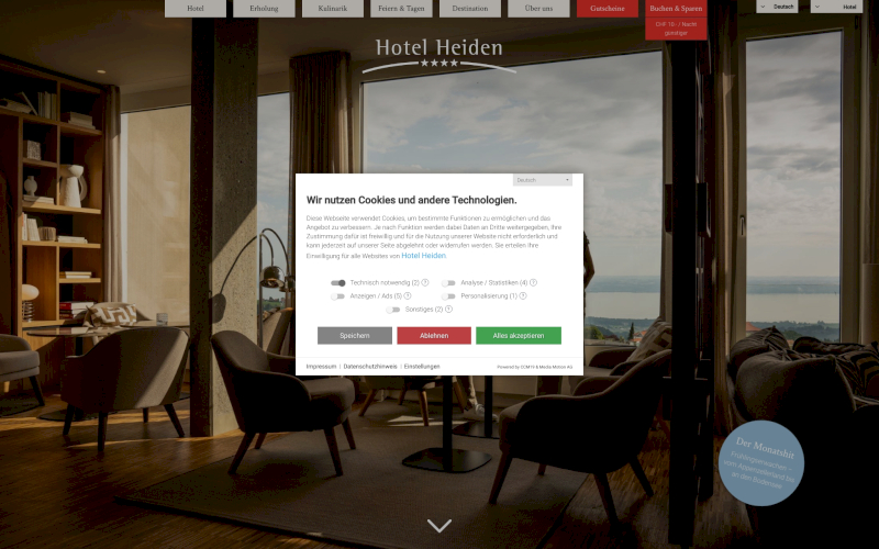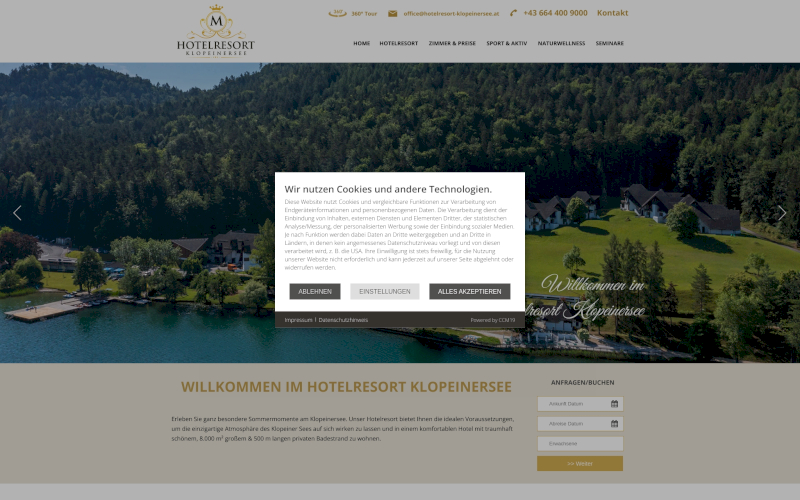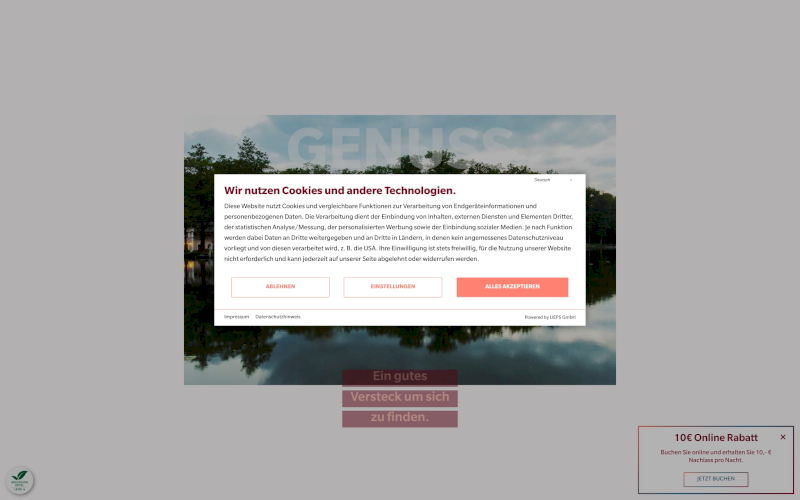 Das Herzstück von CCM19 für Ihre Wellnesshotels Webseite, Onlineshop oder sonstige Applikation - der Cookie Banner für Wellnesshotels. Mit diesem Banner realisieren Sie auf Ihrer Webseite die notwendige Zustimmung zum Setzen von diversen Cookies und zum ausführen von (Tracking)Skripten.