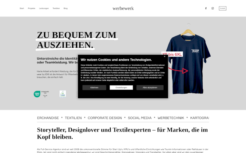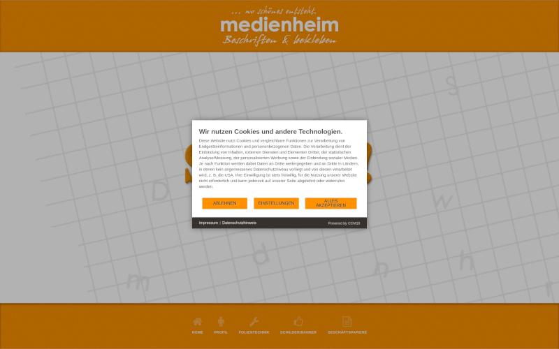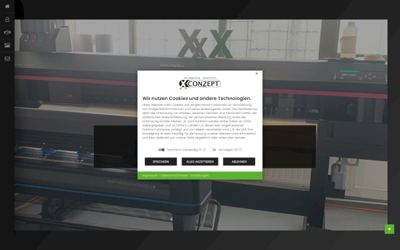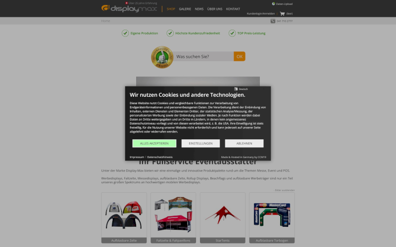 Das Herzstück von CCM19 für Ihre Werbetechnik-Firmen Webseite, Onlineshop oder sonstige Applikation - der Cookie Banner für Werbetechnik-Firmen. Mit diesem Banner realisieren Sie auf Ihrer Webseite die notwendige Zustimmung zum Setzen von diversen Cookies und zum ausführen von (Tracking)Skripten.