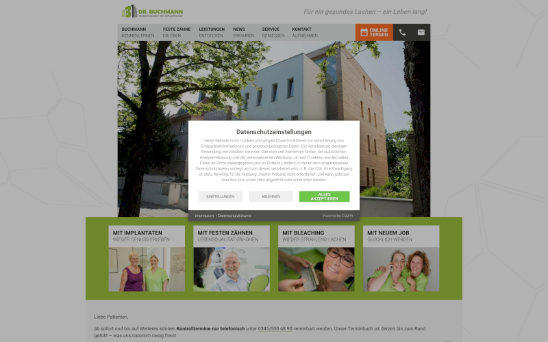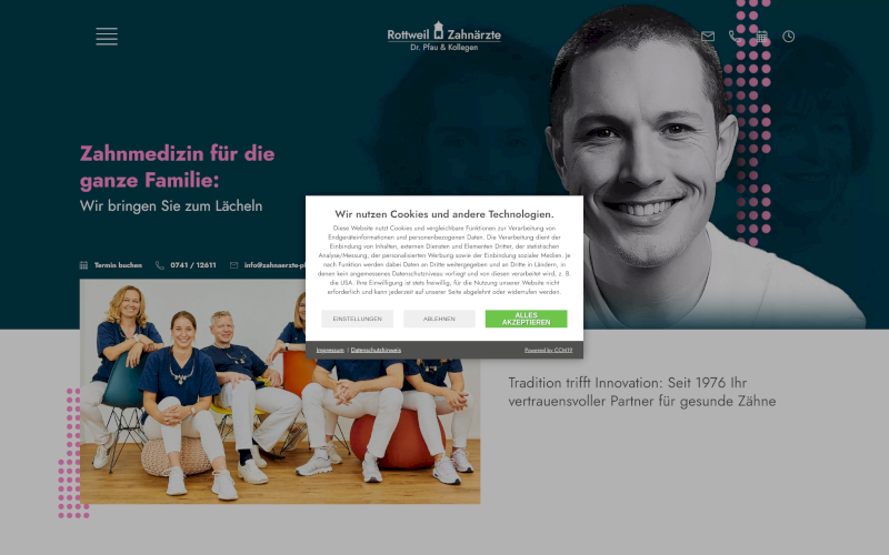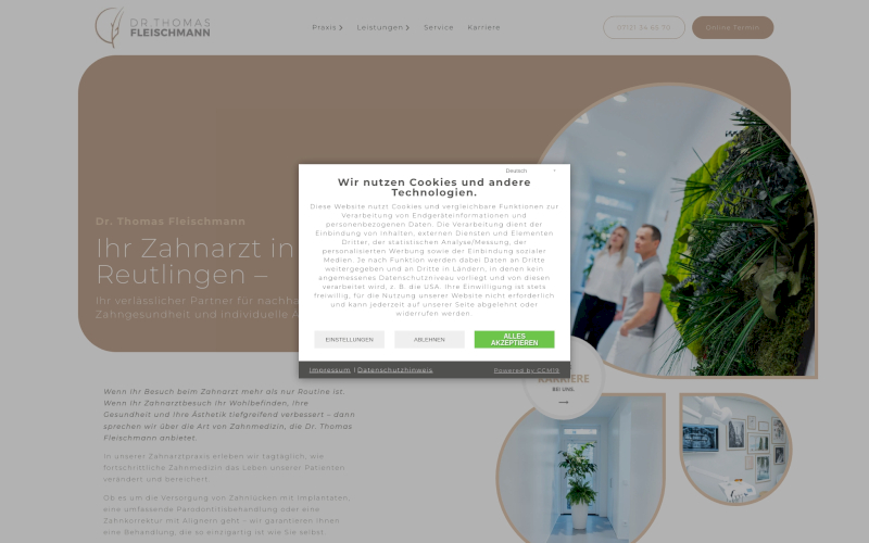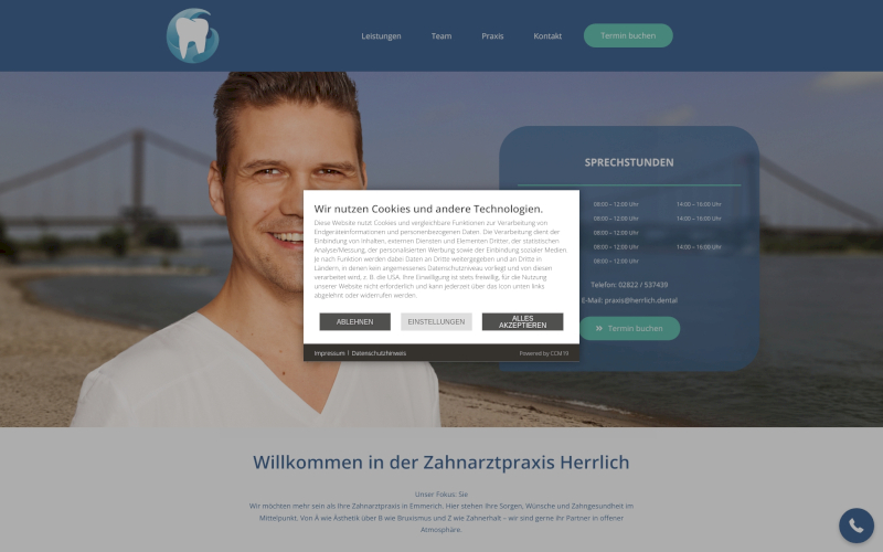 Durch die flexible Anpassbarkeit an Gesetzesänderungen und die Möglichkeit, die CCM-Lösung komplett nach Ihren Bedürfnissen zu gestalten, bietet CCM19 eine zuverlässige Lösung für Zahnärzte. Sie entscheiden selbst, ob und wie Cookies und andere Dienste auf Ihrer Webseite genutzt werden dürfen - eine essenzielle Anforderung zum Schutz der Patientendaten und zur Vermeidung von Bußgeldern und Abmahnungen.