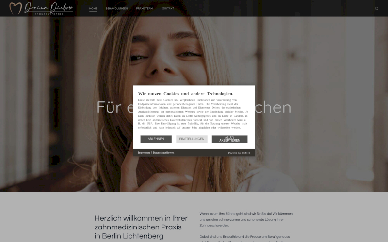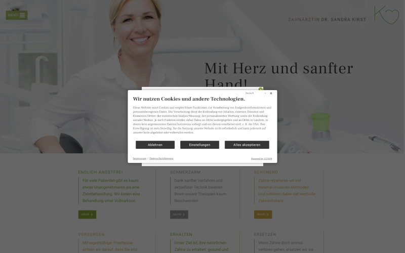Das Herzstück von CCM19 für Ihre Zahnärzte Webseite, Onlineshop oder sonstige Applikation - der Cookie Banner für Zahnärzte. Mit diesem Banner realisieren Sie auf Ihrer Webseite die notwendige Zustimmung zum Setzen von diversen Cookies und zum ausführen von (Tracking)Skripten.