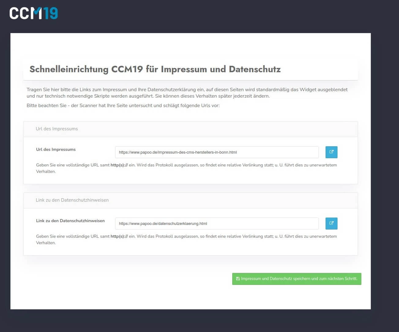 The CCM19 system uses the analyses of your website carried out in advance to automatically identify the links to your legal notice and privacy policy. If these links are correctly identified, the system inserts them directly into the corresponding fields in the setup process.