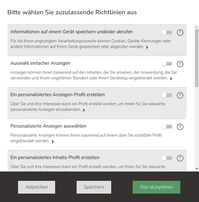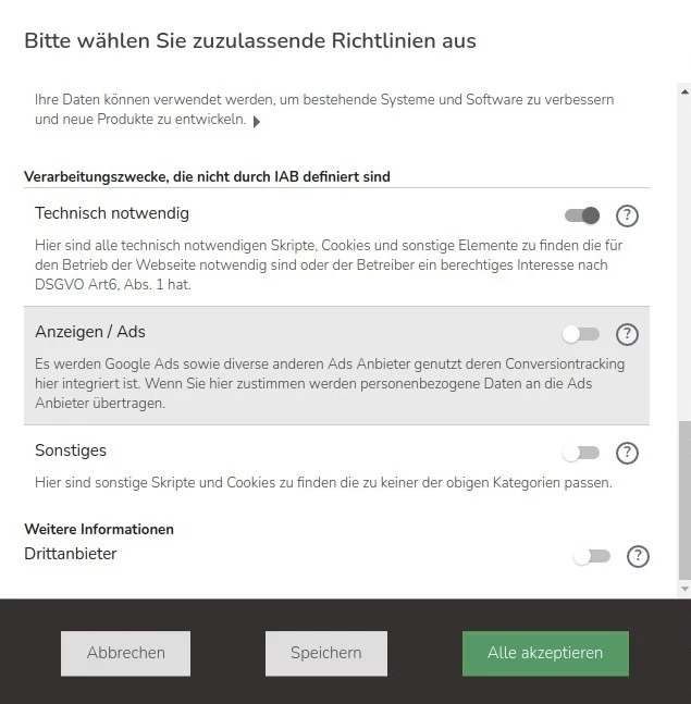 De nombreux fournisseurs de scripts et de services ne font pas du tout partie de l'IAB Framework, mais vous devez bien sûr en informer les visiteurs. C'est pourquoi CCM19 vous donne la possibilité d'intégrer ces fournisseurs dans le masque IAB/TCF V2.
