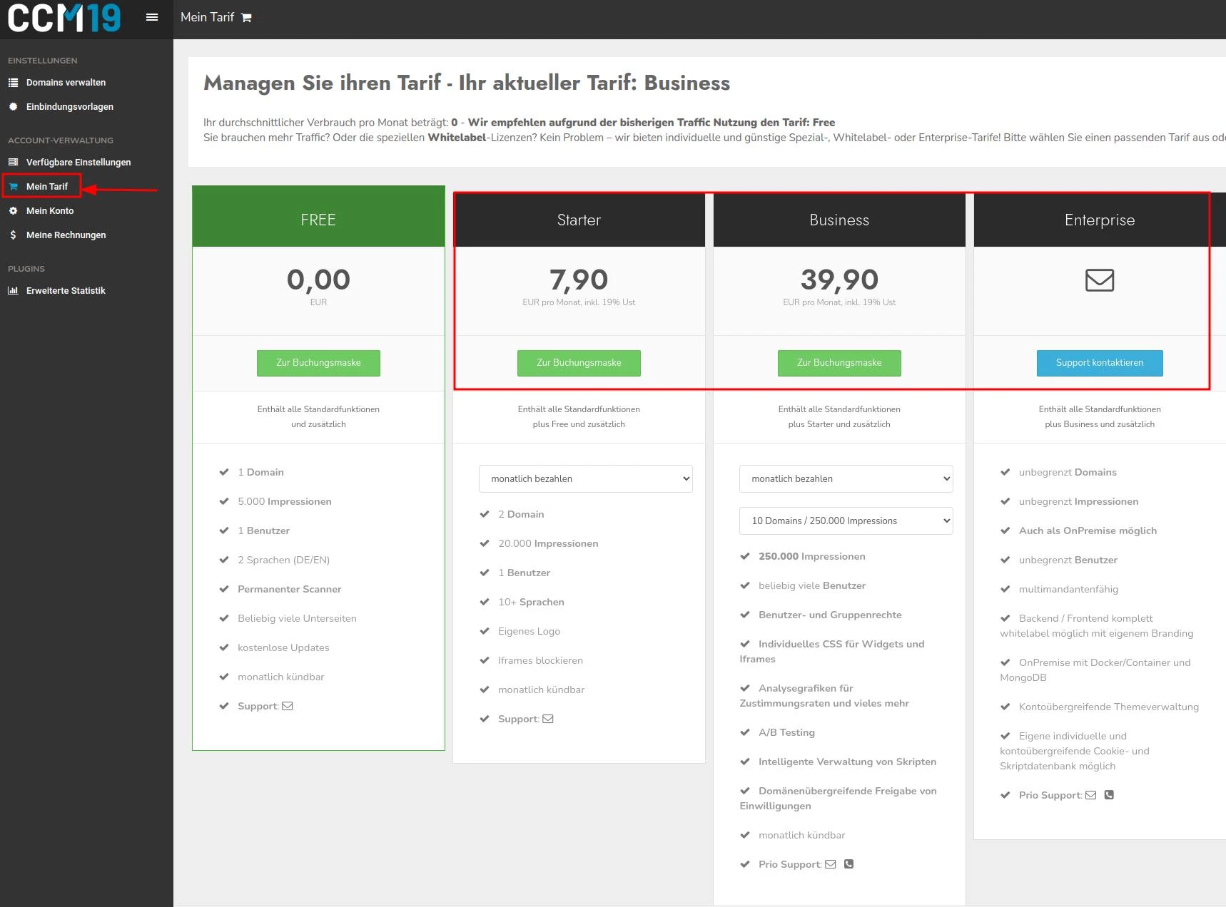 "Accedere al proprio account CCM19 e attivare il blocco iframe alla voce "Le mie tariffe""
