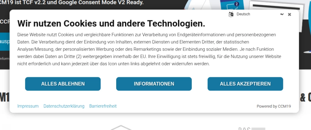 Bei CCM19 begrüßen wir diese Entscheidung ausdrücklich – unsere Software-Lösung hat schon lange vor diesem Urteil den rechtlichen Anforderungen entsprochen. Bereits standardmäßig sieht CCM19 vor, dass Webseitenbesucher zwei passende Buttons angezeigt bekommen: einen zur Zustimmung "Akzeptieren" und einen zur Ablehnung "Ablehnen". Diese befinden sich nebeneinander, auf der ersten Ebene, mit vergleichbarer Sichtbarkeit und Zugänglichkeit und können auch nicht ohne weiteres ausgeblendet werden.