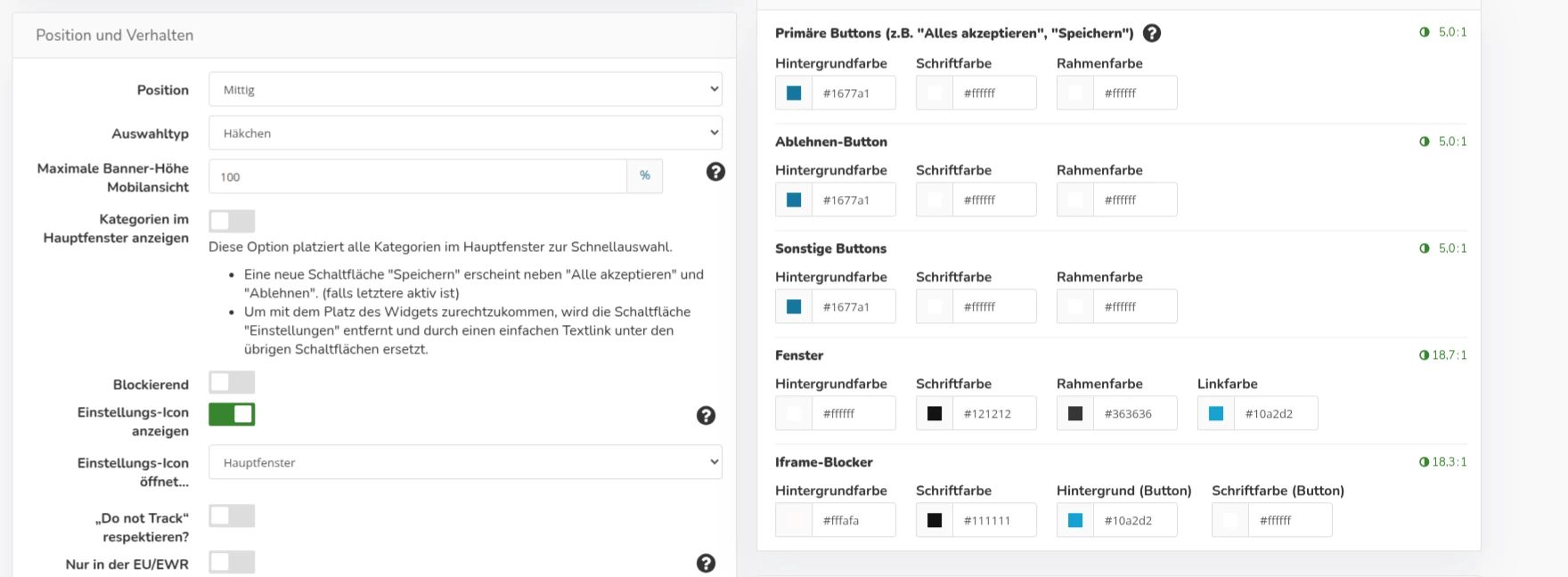 Akzeptieren- und Ablehnen-Schaltflächen müssen gleichwertig und leicht zugänglich sein – sowohl farblich als auch in Größe und Platzierung. Idealerweise identisch, dies ist aber nicht vorgeschrieben zum jetzigen Zeitpunkt und kann aus unserer Sicht auch nicht aus dem obigen Urteil abgeleitet werden. Falls Sie in der Vergangenheit die Farben angepasst haben, schauen Sie am besten einmal kurz rein und ändern Sie das wie gewünscht. - Transparente Sprache: