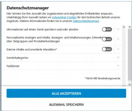 - Ein wiederholter „Alle akzeptieren"-Button auf der zweiten Ebene kann irreführend sein – insbesondere wenn er optisch hervorgehoben ist.