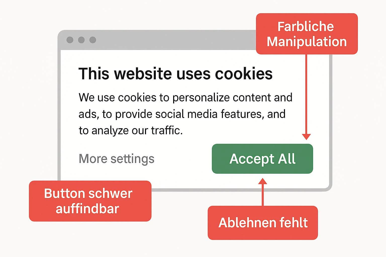 Manipulative Cookie-Banner setzen auf sogenannte Dark Patterns – also Gestaltungsmuster, die Nutzer gezielt in eine bestimmte Richtung lenken sollen.